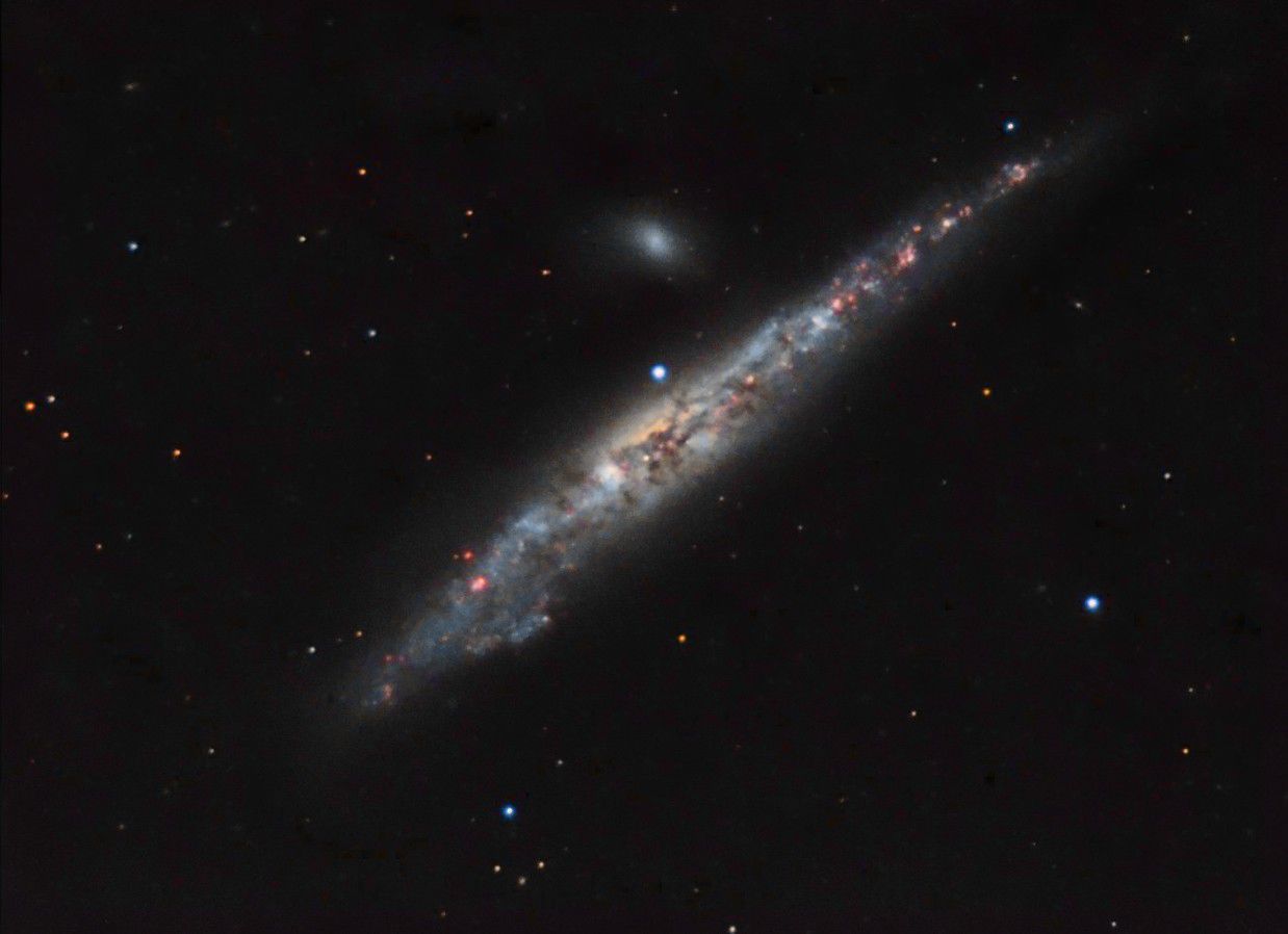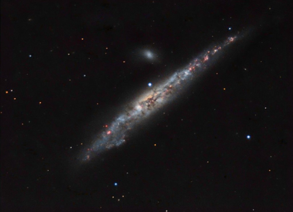 NGC 4631 (also known as the Whale Galaxy or Caldwell 32) is an edge-on spiral galaxy in the constellation Canes Venatici. This galaxy’s slightly distorted wedge shape gives it the appearance of a herring or a whale, whence its nickname. Because this nearby galaxy is seen edge-on from Earth, professional astronomers observe this galaxy to better understand the gas and stars located outside the plane of the galaxy.