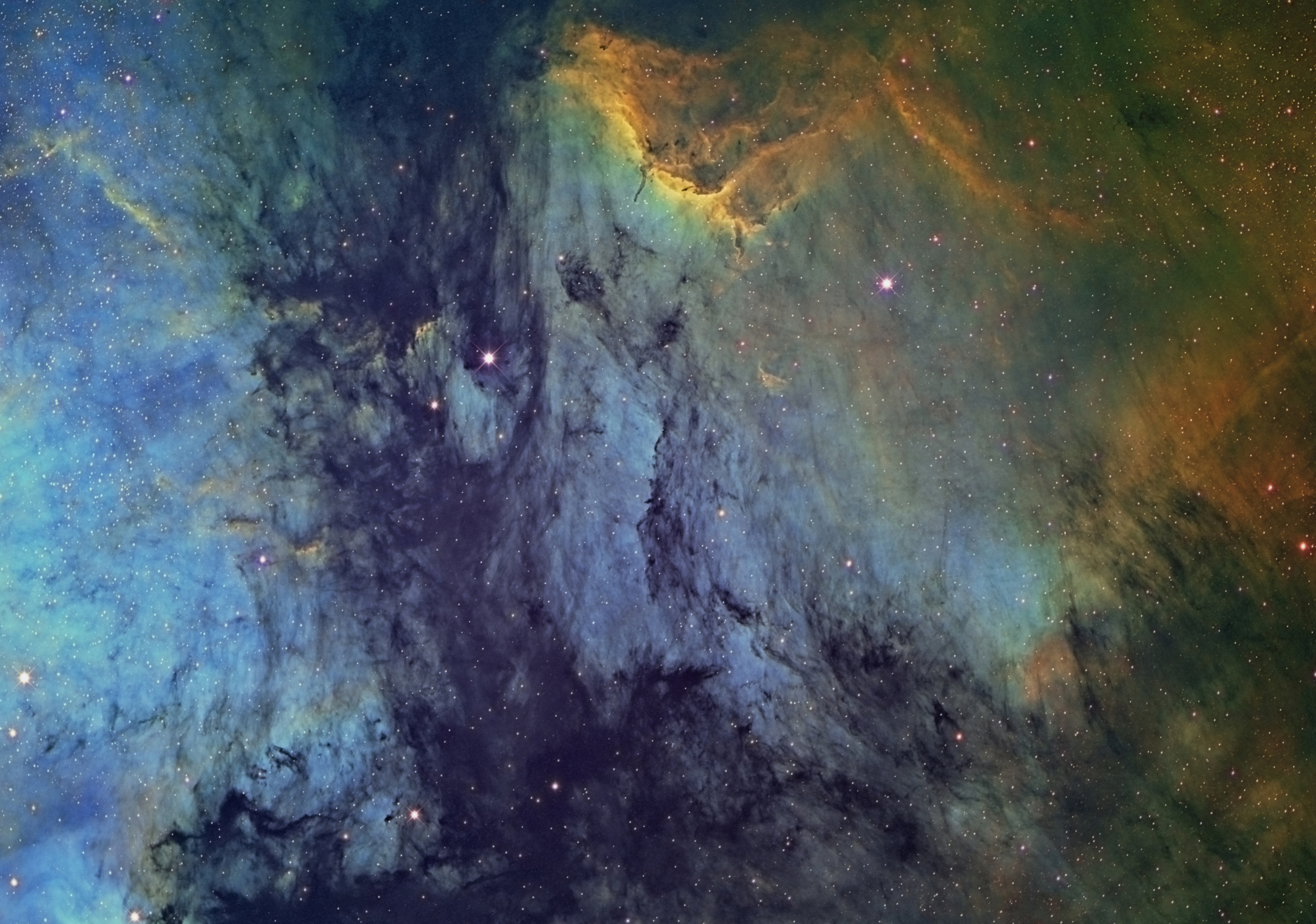 The Pelican Nebula (also known as IC5070 and IC5067) is an H II region associated with the North America Nebula in the constellation Cygnus. The nebula resembles a pelican in shape, hence the name. The Pelican Nebula is a large area of emission nebula in the constellation Cygnus (the Swan), close to Deneb, and divided from its brighter, larger neighbor, the North America Nebula, by a molecular cloud filled with dark dust.