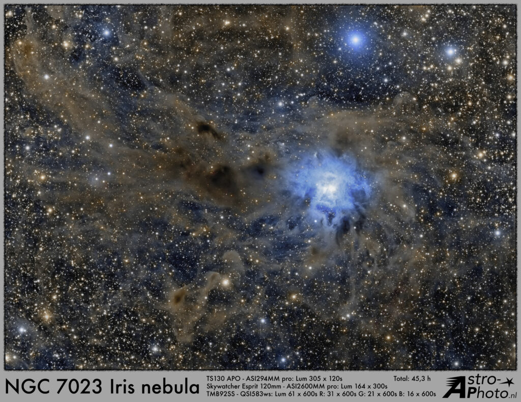 Image of NGC7023, also known as the Iris nebula. I love this region full of dust with its central reflection nebula. It’s quite hard to process this nicely and keep the balance between, dust, stars and other details. I’m quite happy with this result as it is now, especially with the real deep image of all the dark dust in this region.