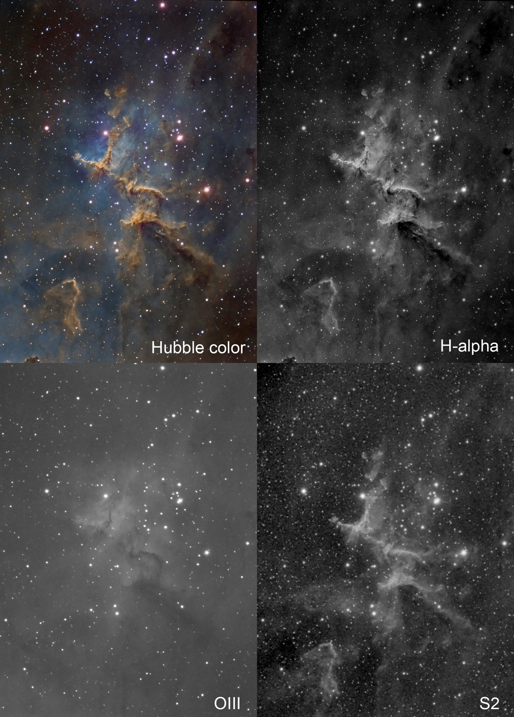 Cosmic clouds seem to form fantastic shapes in the central regions of emission nebula IC 1805. Of course, the clouds are sculpted by stellar winds and radiation from massive hot stars in the nebula’s newborn star cluster, Melotte 15. About 1.5 million years young, the cluster stars are in the center of this colorful skyscape, along with dark dust clouds in silhouette against glowing atomic gas. A composite of narrow and broad band telescopic images, the view spans about 5 light-years and includes emission from hydrogen in green, sulfur in red, and oxygen in blue hues. Wider field images reveal that IC 1805’s simpler, overall outline suggests its popular name – The Heart Nebula. IC 1805 is located about 7,500 light years away toward the constellation Cassiopeia.